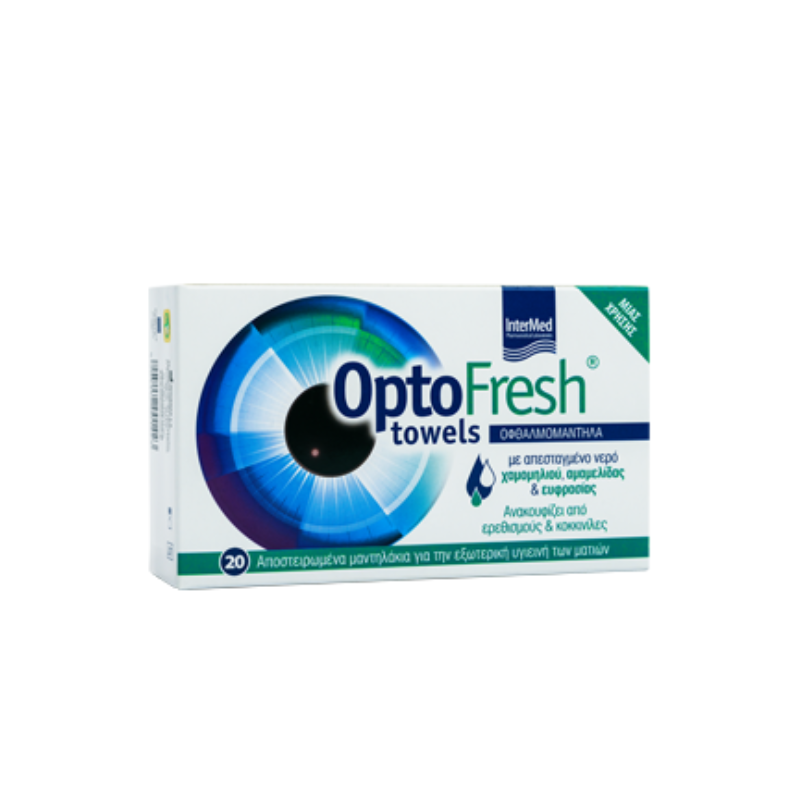 Τα OptoFresh towels είναι αποστειρωμένα οφθαλμομάντηλα για τoν αποτελεσματικό καθαρισμό και τη φυσική ανακούφιση των ξηρών, κουρασμένων & ερεθισμένων βλεφάρων. Με απεσταγμένο νερό χαμομηλιού (για να εκμηδενίζονται οι πιθανότητες αλλεργικών αντιδράσεων), αμαμελίδας και ευφρασίας.