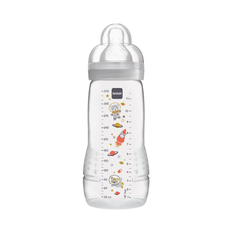 Μπιμπερό Mam από πολυπροπυλένιο, με θηλή σιλικόνης, εργονομικό, ελαφρύ, ασφαλές καπάκι, εύκολο γέμισμα και πλύσιμο.