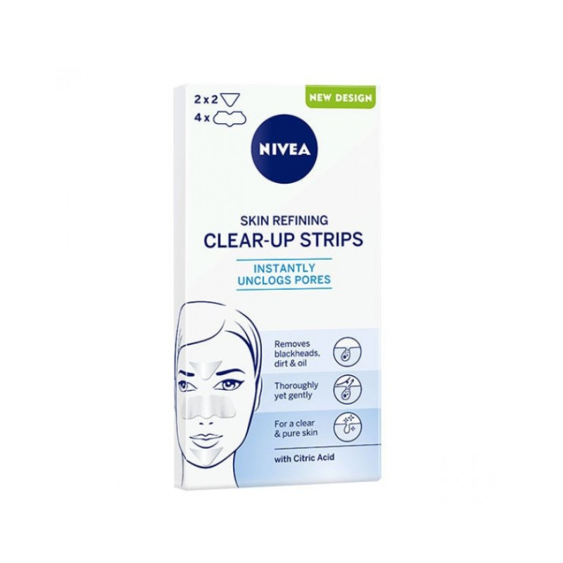 Οι NIVEA Clear-Up Strips είναι ειδικά σχεδιασμένες ταινίες καθαρισμού για τη μύτη, το μέτωπο και το πηγούνι (περιοχή Τ), που αφαιρούν αποτελεσματικά το σμήγμα και τα μαύρα στίγματα από τους κλειστούς πόρους. Με την ενεργοποίησή τους με νερό, κολλάνε στα μαύρα στίγματα, στη λιπαρότητα και στις ατέλειες, καθαρίζοντας σε βάθος την επιδερμίδα.