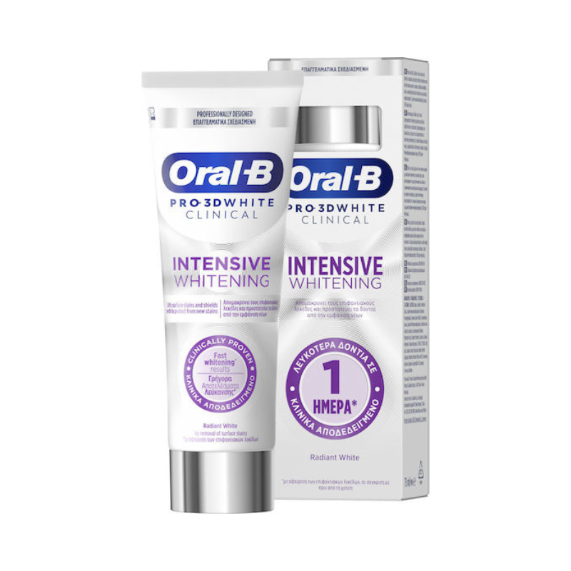 Η οδοντόκρεμα Oral-B Pro 3D White Clinical Intensive Whitening προσφέρει κλινικά αποδεδειγμένα πιο λευκά δόντια ήδη από την πρώτη ημέρα χρήσης, χάρη στην προηγμένη Τεχνολογία ιόντων. Η σύνθεσή της δρα αποτελεσματικά στους επιφανειακούς λεκέδες, χαλαρώνοντάς τους χωρίς έντονο τρίψιμο, ενώ παράλληλα προστατεύει από τη δημιουργία νέων. Ειδικά σχεδιασμένη με τη συμβολή οδοντιάτρων, είναι κατάλληλη για ευαίσθητα δόντια, προσφέροντας λευκό, καθαρό και υγιές χαμόγελο χωρίς ερεθισμούς. Περιέχει Μονοφθοροφωσφορικό νάτριο (1450 ppm Φθορίου) για ενίσχυση της αντοχής της αδαμαντίνης και προστασία από την τερηδόνα. Με αναζωογονητικό άρωμα μέντας που χαρίζει δροσερή αίσθηση φρεσκάδας μετά από κάθε χρήση.