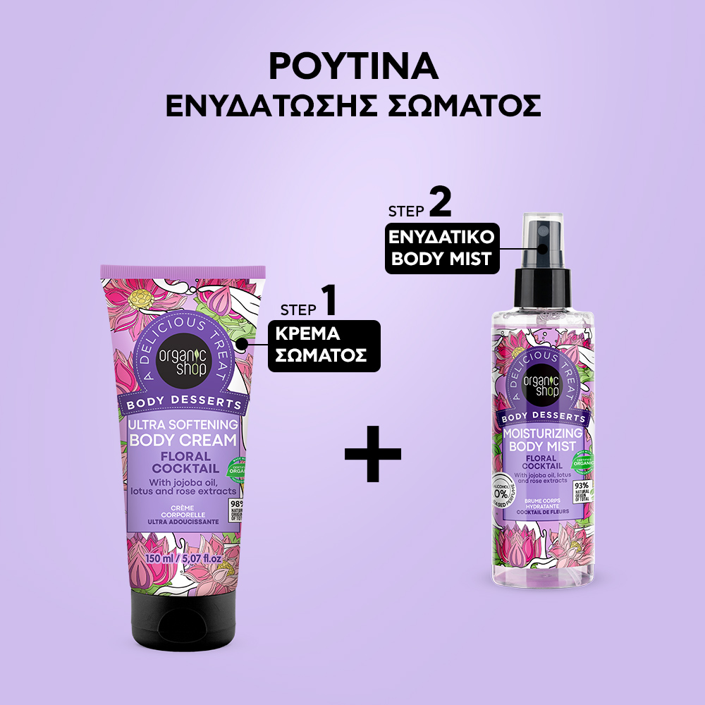 Η σειρά Body Desserts της Organic Shop προσφέρει πολυτελή, φυσική φροντίδα που ενυδατώνει, θρέφει και αναζωογονεί το σώμα. Το Mist Σώματος Floral Cocktail είναι το μυστικό σου για ενυδατωμένο, λείο και λαμπερό δέρμα — μια εμπειρία περιποίησης σώματος γεμάτη φρεσκάδα, άρωμα και φυσική ομορφιά.